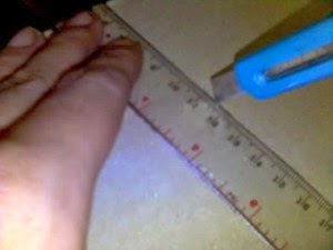- tarik garis vertical dari atas ke bawah dengan memakai pisau cutter sesuai sama titik yang sudah di tandai. hati-hati! jangan sempat menembus susunan kardus paling bawah, lantaran kardus bakal terbelah jadi dua sisi. cukup susunan pertama saja yang di potong garis.